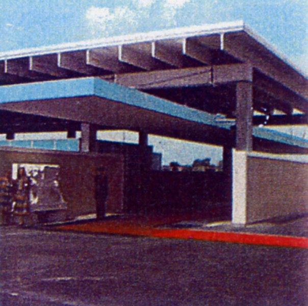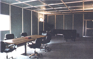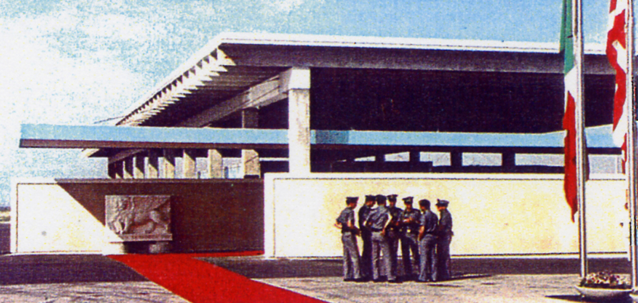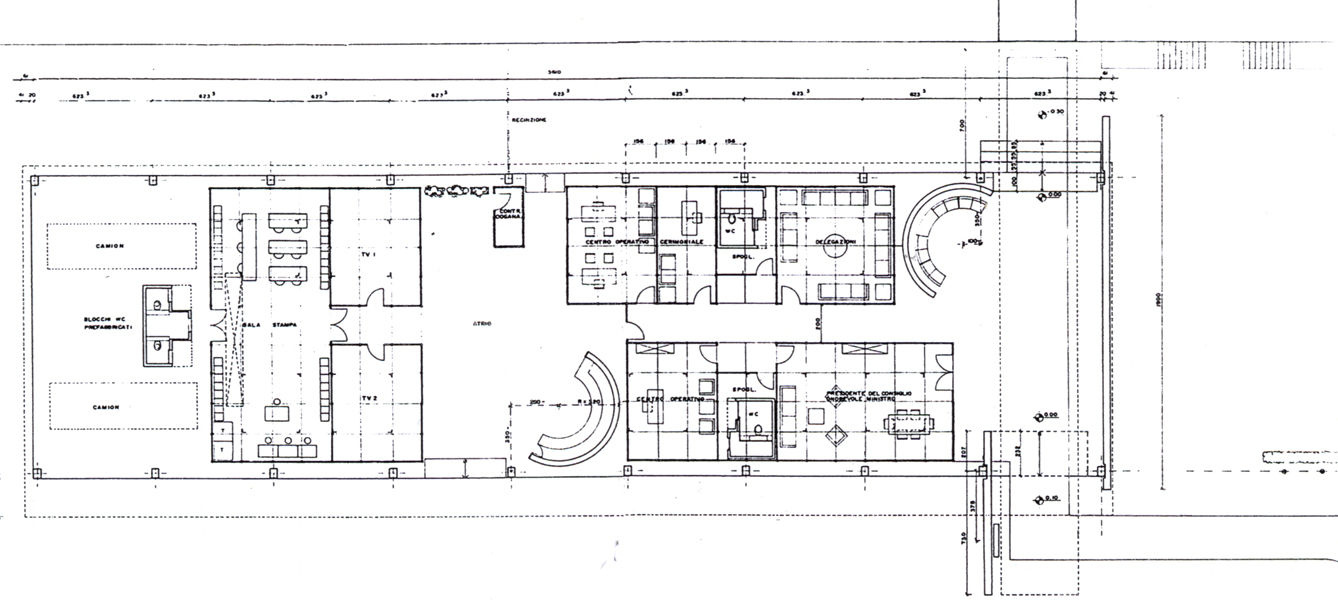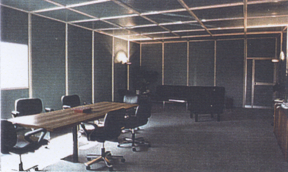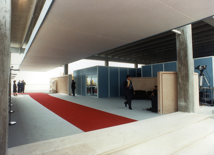Allestimento temporaneo del padiglione per il Vertice Economico 1987, costituito da sale stampa, ricevimento, uffici, servizi, bar; strutture e pannelli prefabbricati in alluminio.